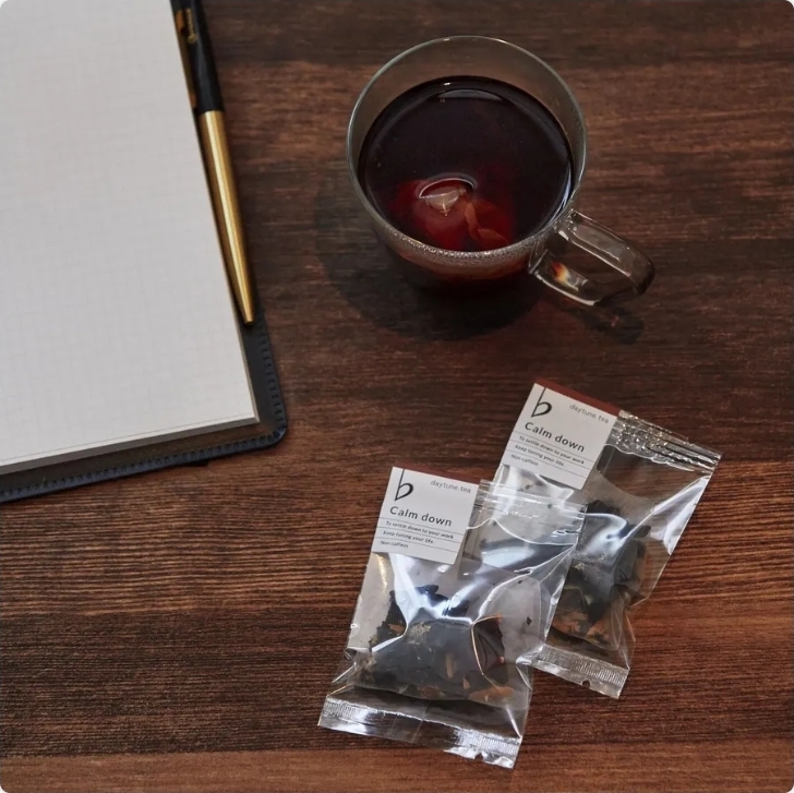 Calm downブレンドは、深く落ち着きたいときのための、コーヒーのような苦味のある焦げ茶色のティー。香ばしさとコクを演出するために、焙煎したチコリの根の苦味を生かしつつ、シナモンやフェンネルシード等のスパイスハーブの複雑な風味をプラスした、上品で落ち着いた味わいのブレンド。